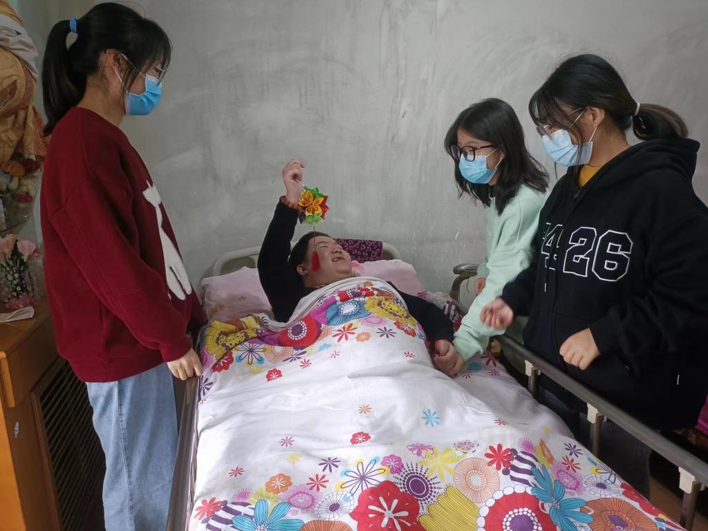 志愿者们集合前往华楠姐姐住处。阿姨热情地和志愿者分享了华楠姐姐近期的变化,华楠姐姐微笑着向志愿者们伸出手打招呼。志愿者给华楠姐姐带去自己亲手做的手工花和书签,教姐姐说出花朵的颜色。志愿者们还与华楠姐姐进行手指互动、扳手腕,引导华楠姐姐自主抬高手臂,锻练抓握能力。