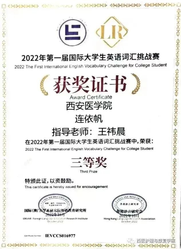 “青春由磨砺而出彩,人生因奋斗而升华”。学习之余,连依帆加入校广播站,校音乐协会吉他部,bat365在线中国官网登录入口南丁格尔青年志愿者服务队,bat365在线中国官网登录入口团总支学生会,在群团组织中增长见识。疫情期间,连依帆作为护本2218班心理委员,积极响应学校号召,踊跃报名参与核酸检测志愿服务;2023年积极参与西安市儿童医院志愿服务,并有幸担任“世界孤独症日”讲座志愿者,在实践中淬炼本领,增长才干。