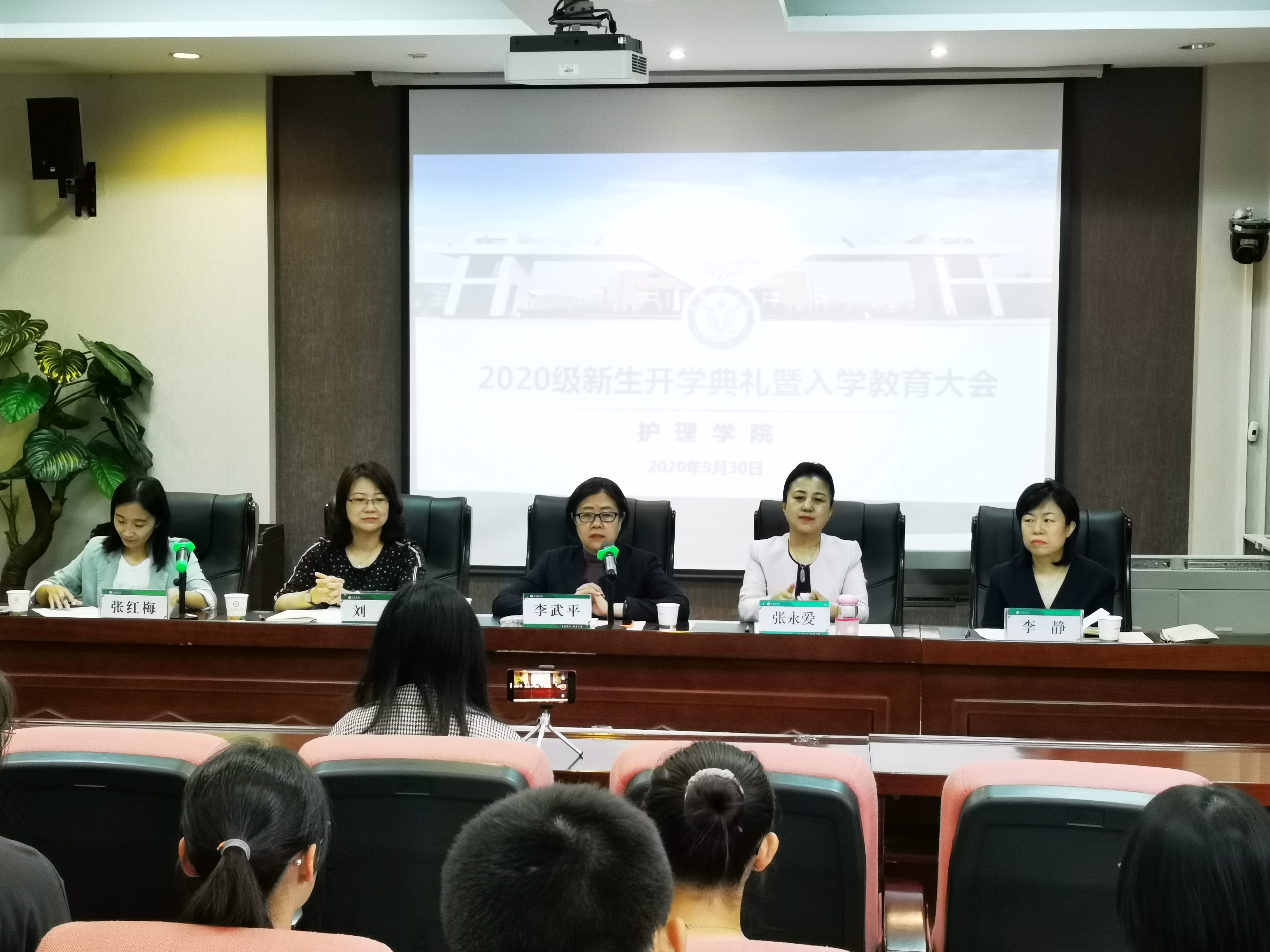2020年9月30日上午,护理学院举办2020级新生开学典礼暨入学教育大会。本次大会特别邀请陕西护理学会理事长李武平教授出席,护理学院院长张永爱、党总支副书记刘庆、教学科科长李静及2020级新生辅导员参加。会议由护理学院学生科科长张红梅主持。