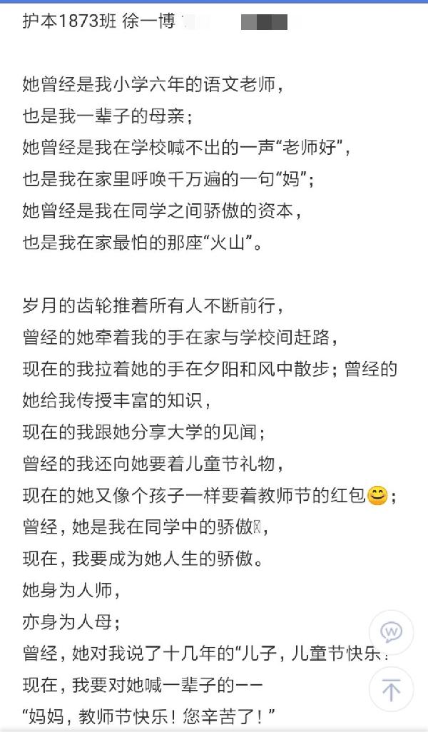 护本1873班徐一博写给教师母亲的诗