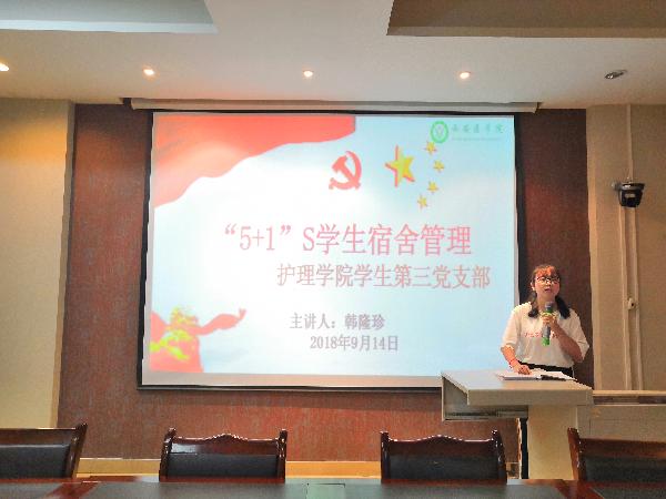 开学前,护理学院学生党支部三位支部书记魏咪咪老师、阎坤老师、董维娜老师分别向各学生支委和学生党员强调,要提前熟悉学习、并做好“5+1”S学生宿舍管理计划的工作安排;开学第一周,护理学院学生党支部组织召开新生干部培训会暨“5+1”S宿舍管理培训会,为新生干部们讲解“5+1”S的内涵、相关要求以及实施意义,并详细介绍了关于“5+1”S宿舍管理计划的考核标准等详细内容;军训期间,护理学院学生第一党支部书记董维娜老师,带领护理学院学生党员进宿舍,积极打造“5+1”S宿舍样板间,更有新生教官亲自到宿舍指导学生整理内务,在学生党支部书记和教官的指导下,新生宿舍环境得到明显改善。9月中旬,护理学院学生党支部负责人到全科医学院3号公寓楼进行参观学习,深入学习“5+1”S宿舍管理计划的具体办法和督查措施;9月中下旬,护理学院学生第三党支部制定了党员进宿舍分配一览表及党员进宿舍具体措施,三个学生党支部都做到了:一个党员联系一个宿舍,一个积极分子帮扶一位新生,积极帮新生们营造良好的宿舍环境,解决生活中遇到的实际困难。