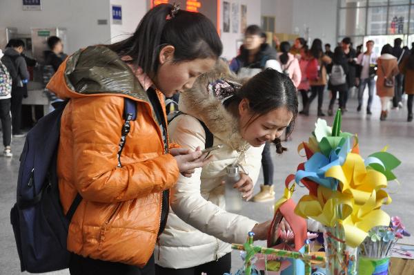 同学们观看手工艺作品展