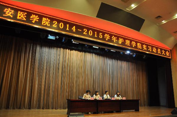7月3日下午,护理学院2014-2015学年实习动员大会在学术报告厅召开。院长张永爱、党总支副书记郭婷、第二附属医院护理部主任曾娟出席会议并讲话。党政办公室主任刘庆、教学管理科科长李静、团总支副书记白洁、各班辅导员老师以及12级护理专业实习生、13级助产专业实习生参加了会议。会议由学生管理科科长昝倩主持。