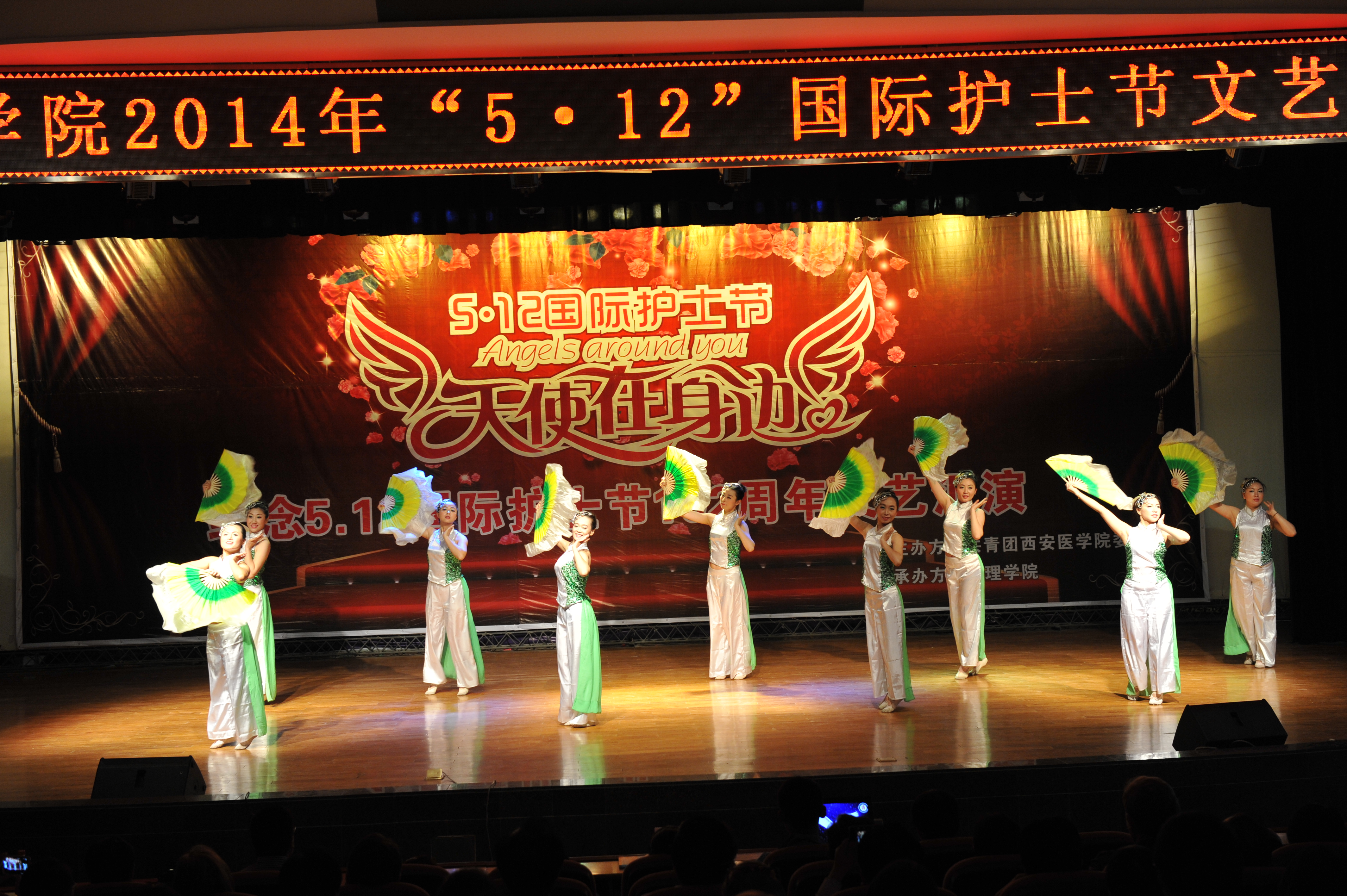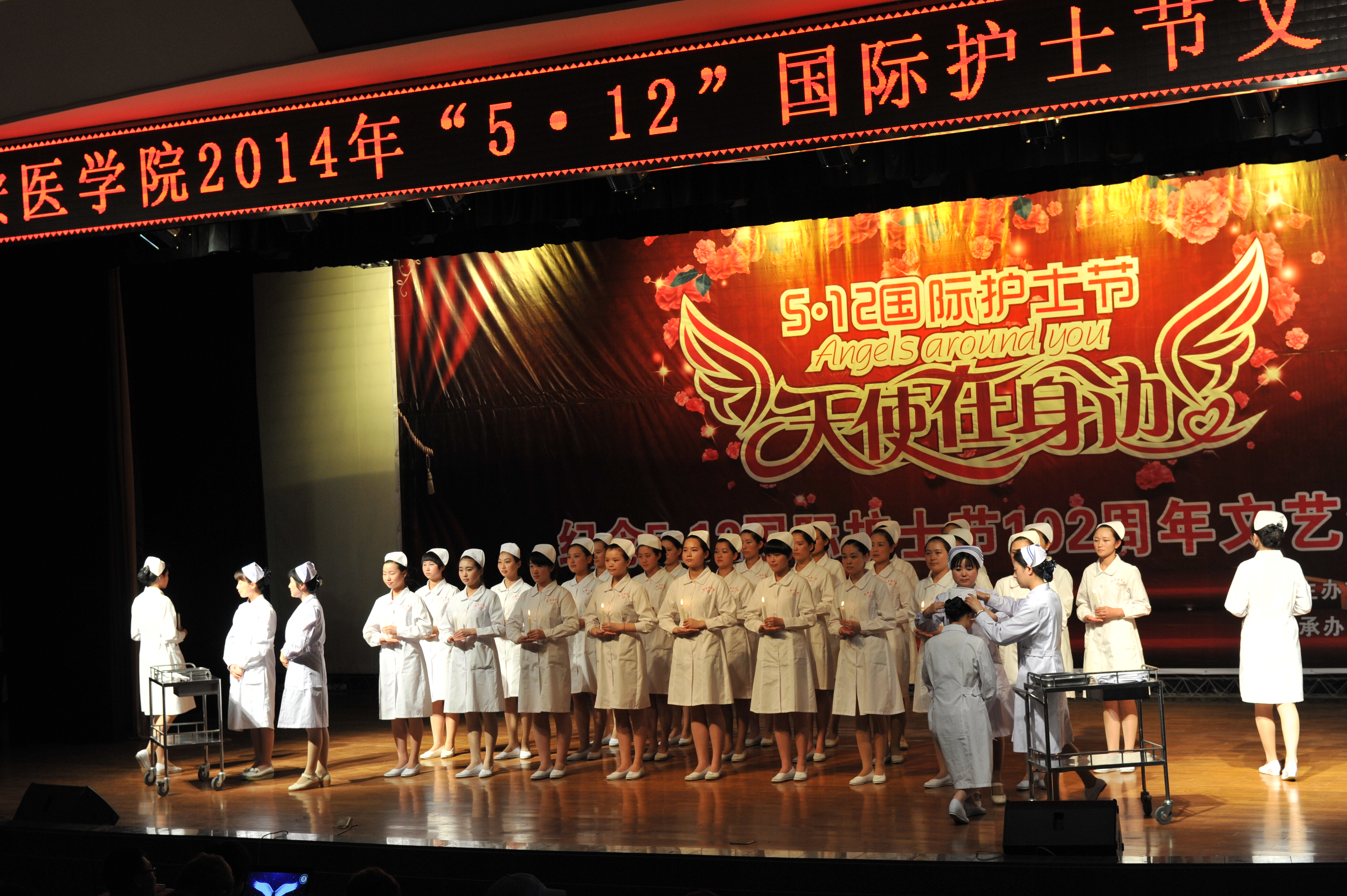 2014年5月12日,由校团委主办、护理学院承办的“5·12国际护士节文艺汇演”在校学术报告厅隆重举办。莅临本次活动现场的嘉宾有:bat365在线中国官网登录入口党委书记范兵教授、院长唐俊琪教授、副院长弥曼教授、纪委书记张兴邦教授、副院长黄保强教授、各行政处室教学单位的领导老师以及来自美国韦伯州立大学健康学院的老师及学生们。