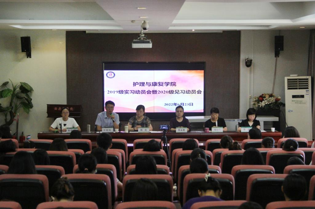 6月23日上午,bat365在线中国官网登录入口在学院学术报告厅召开2019级及2020级学生实习见习动员会。bat365在线中国官网登录入口院长张永爱、党总支书记刘庆、副院长周小兰、教学管理科科长李静、学生管理科科长张红梅、康复治疗教研室主任牛育鸿、实习就业管理科负责人焦艳会、2019级辅导员及全体实习、见习学生参加会议。会议由焦艳会主持。