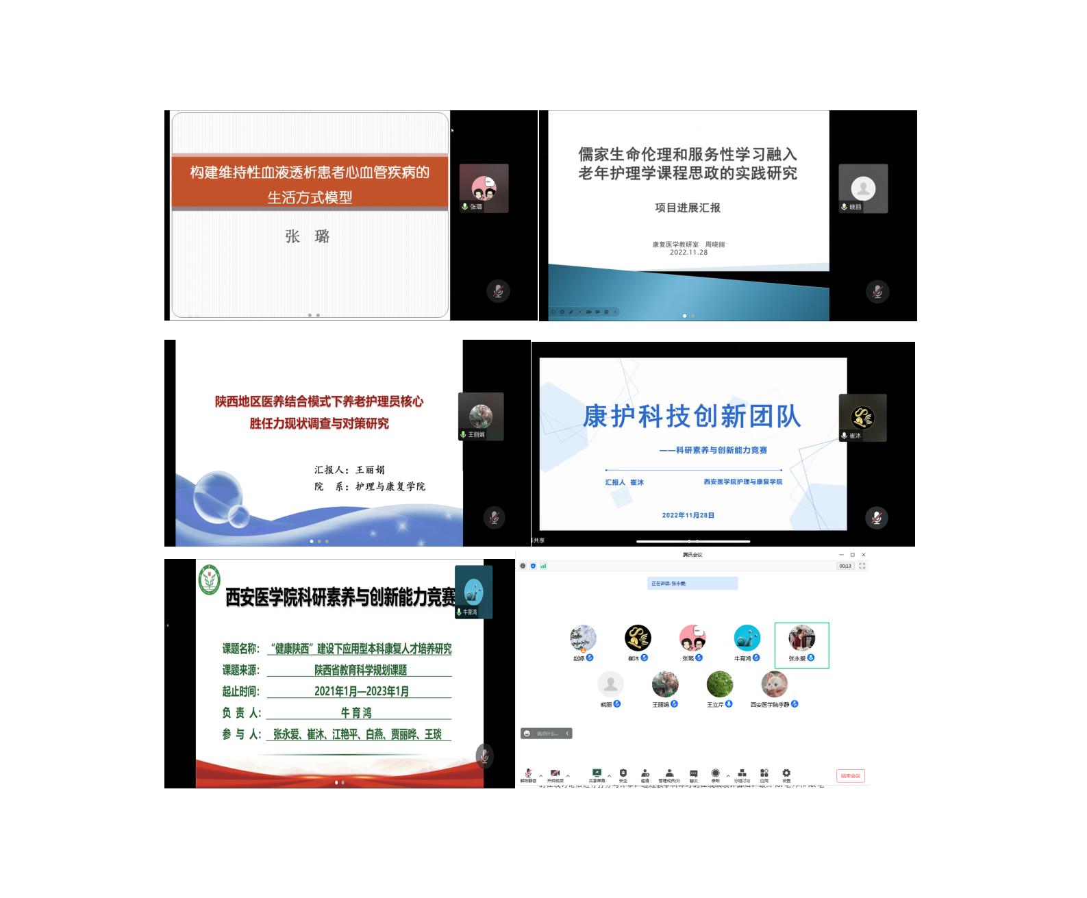 牛育鸿老师展示讲解了“健康陕西”建设下应用型本科康复人才培养研究,通过详实的原始数据记录、扎实的科研工作推进及教研结合培育康复专业人才的方式,将自己项目的进展过程逐一分享讲解,并获得了比较丰硕的科研成果。崔沐老师以“康护科技创新团队”为依托,将康复专业与护理专业人才创新培养模式进行分享,通过创新手段将多学科人才建设及培养融为一体,以实际的科研项目践行创新人才培育要求,想法和思路得到各位评委的认可。