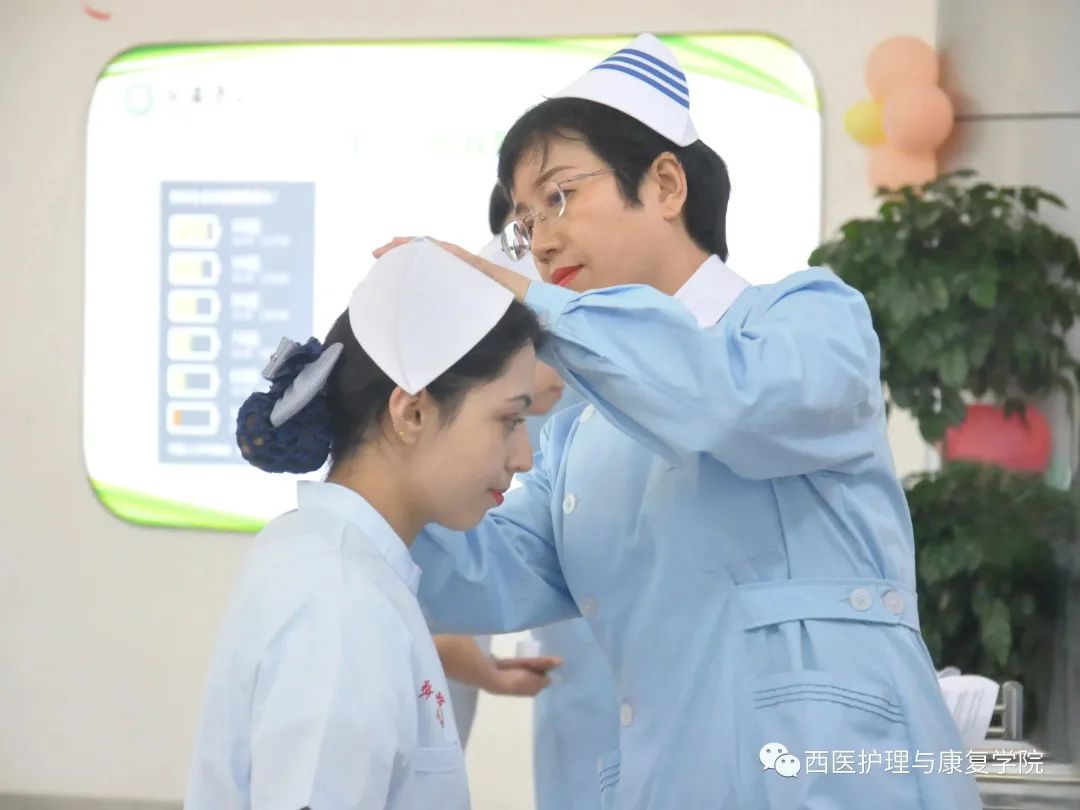 第二项护生授帽仪式由学院教学管理科科长李静教授、外科护理教研室李贞教授,基础护理教研室老师胡健薇,外科护理教研室刘鑫为护生授帽。护生戴上象征圣洁的燕帽,接过前辈手中的蜡烛,怀揣着对护理事业的无上崇敬,庄严宣誓,南丁格尔誓言响彻天空,表达了为护理事业献身的决心。