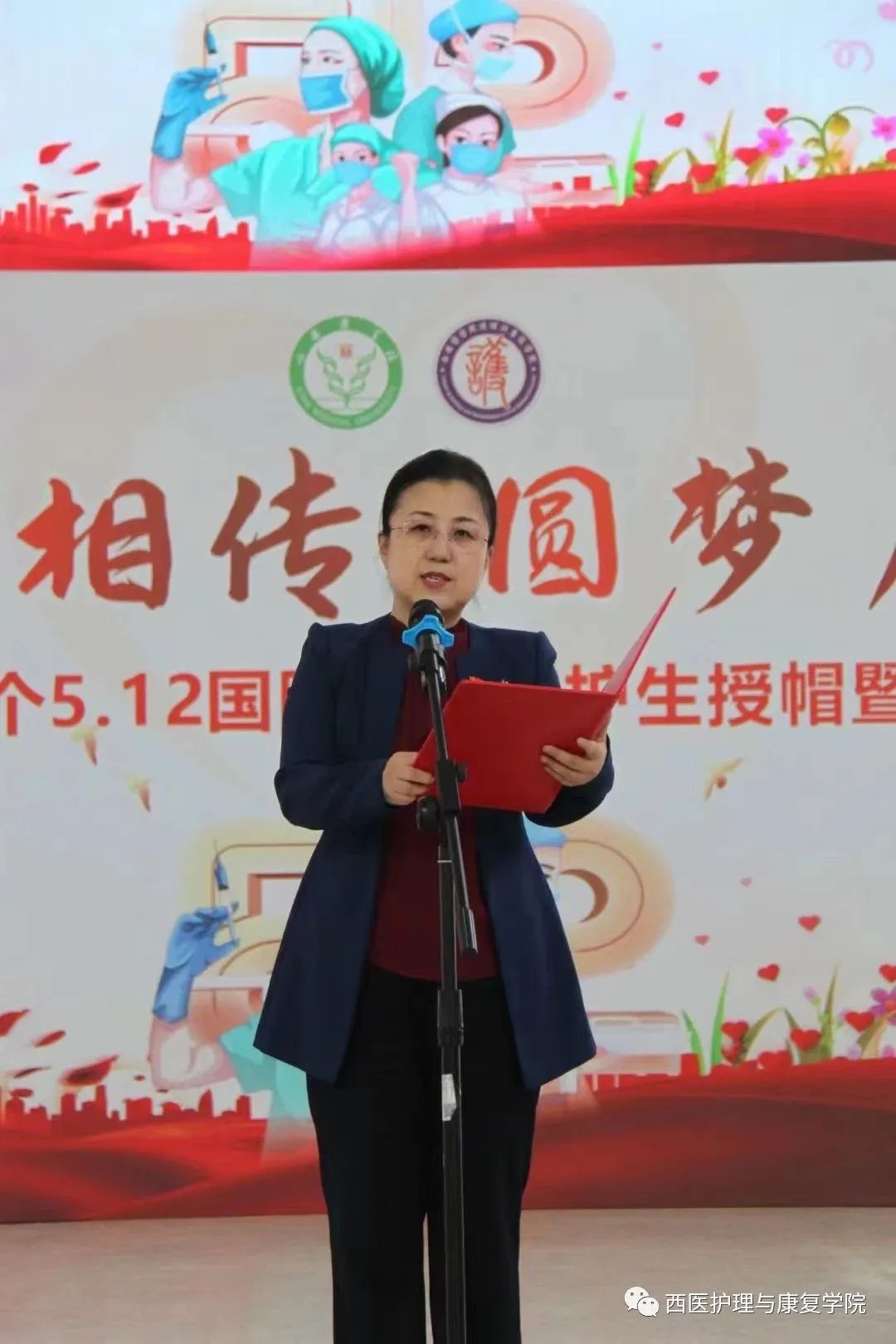 接着,bat365在线中国官网登录入口院长张永爱上台致辞。首先,她表示非常开心在这个美好的季节里迎来了第112个“5·12国际护士节”。就在昨天,我们学院刚刚顺利完成了护理学专业认证现场考察,得到了教育部认证专家组的充分认可。这次认证让她深深体会到了我们西医人自强不息的奋斗精神,团结、拼搏、积极向上的西医精神!感谢我们学院全体师生的辛勤付出,相信bat365在线中国官网登录入口专业建设定会高质量发展,再上一个新台阶。今年我国护士节的主题是“发展护士队伍,改善护理服务”,并带领我们回顾了克里米亚战争时期的南丁格尔精神以及我校护理教育70年的发展史,她指出,纪念“5·12”国际护士节护生授帽仪式是护生成为护士的重要时刻,目的在于学习和传承南丁格尔精神,激励广大护理专业学生继承和发扬护理事业的光荣传统。她表示作为学科带头人,在学校党委的正确领导下,积极推动学科及专业建设,在教育教学改革、科学研究、人才培养及国际化建设等方面取得了长足发展,并形成了一套特色鲜明的护理人才培养模式,先后获批本科特色专业、“应用型护理人才培养模式创新实验区”、“护理专业综合改革试点项目”、双创学院等 20多项陕西省普通高等学校本科教育教学工程项目。同时,护理学专业在国家“双万计划”中获批了国家级“一流本科专业”建设点,妇产科护理学、社区护理学两门课程获批了“国家级一流本科课程”,使bat365在线中国官网登录入口专业建设上了一个台阶,有了新的突破。去年,我们学院《护理专业一流人才培养与实践》教学成果获得了陕西省普通高等学校优秀教学成果一等奖。其中最大的成果是这十年来,bat365为社会培养输送了 4118名 的护理专业本科毕业生,平均就业率超过90%,历届毕业生的全国护士执业资格考试一次性通过率99%左右,毕业生以“综合素质高、临床技能强、科研基础好”而得到各用人单位的高度认可。最后她希望同学们要牢牢记住习近平总书记对青年学生提出的“四点希望”,要“爱国、励志、求真、力行”,成为具有南丁格尔精神的、专业技能精湛的优秀护理人才,青春逢盛世,奋斗正当时。