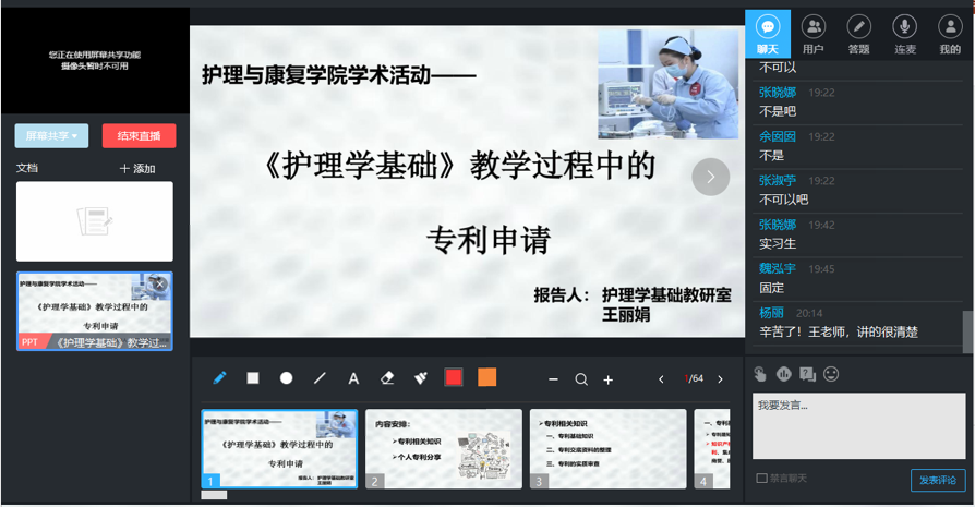 11月5日晚,护理学基础教研室王丽娟老师通过学习通线上平台进行了题目为“《护理学基础》教学过程中的专利申请”的讲座。讲座首先介绍了有关专利的基本知识,特别是对专利交底资料整理中的注意事项进行了重点讲解。接着进行了个人专利分享,通过讲解对教学过程中涉及的操作用物改进提出专利申请的案例,详实介绍了专利申请准备的具体事宜。