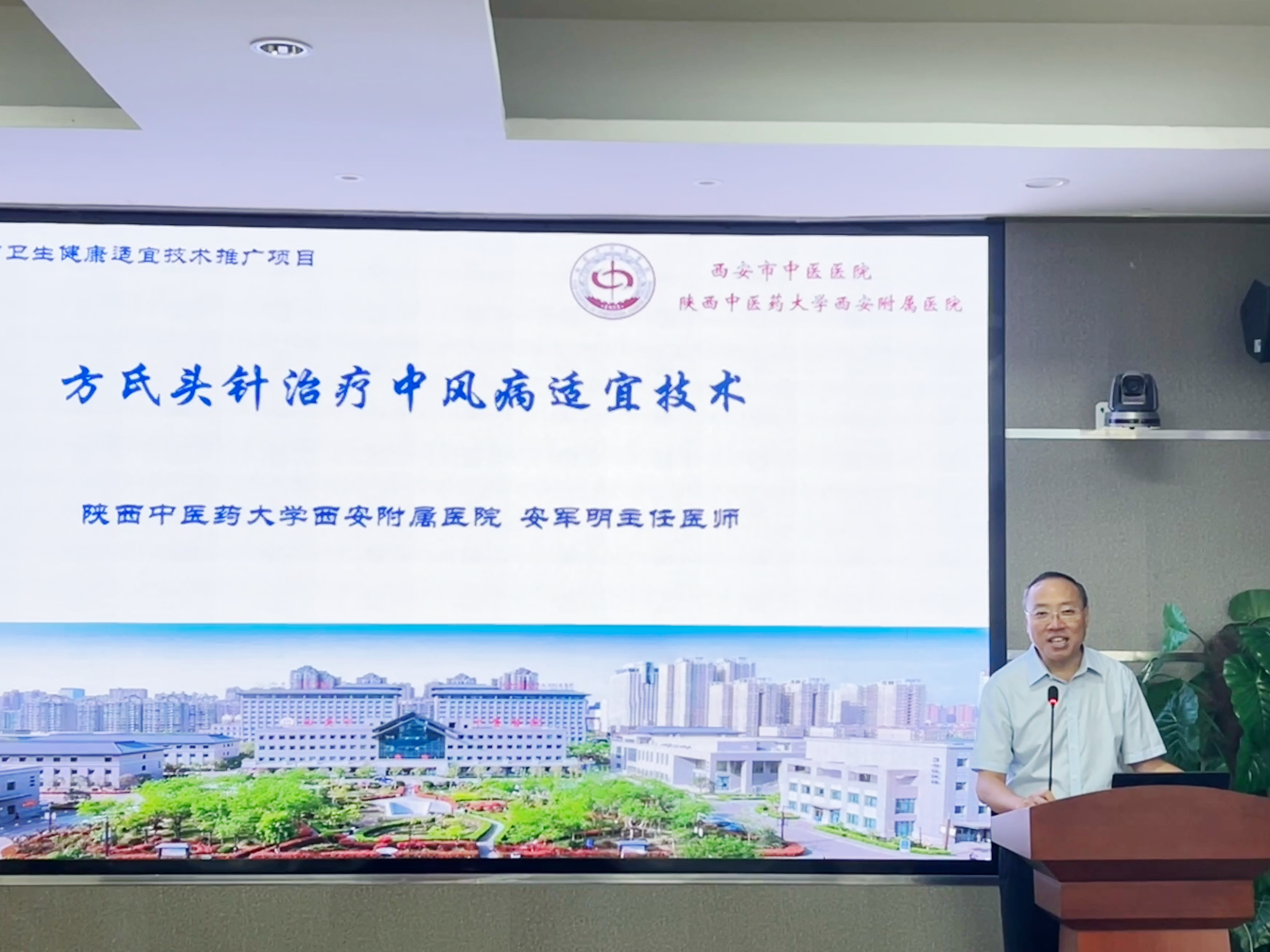 安军明首先简要介绍西安市中医医院及针灸治疗技术的发展及学科概况,并着重介绍“方氏头针”的起源及发展,从“头针科研组”到全国医药卫生科技奖,“方氏头针”的应用逐渐成熟,可治疗中风病、偏瘫、认知功能障碍、睡眠障碍、言语障碍等一系列慢性疾病,并在功能恢复上取得较好效果。它通过将头部穴区分为刺激区及刺激穴,分别对应不同的大脑皮层功能,使用不同的行针法促进中风患者运动功能、肢体运动功能等的恢复。安军明作为该技术的第三代代表性传承人,将其广泛应用于临床研究,并作为“省级中医适宜技术”在全省进行全面推广,成立重点研究室,在治病救人过程中培养了一大批针灸技术传承人,并取得丰硕的教学及研究成果。