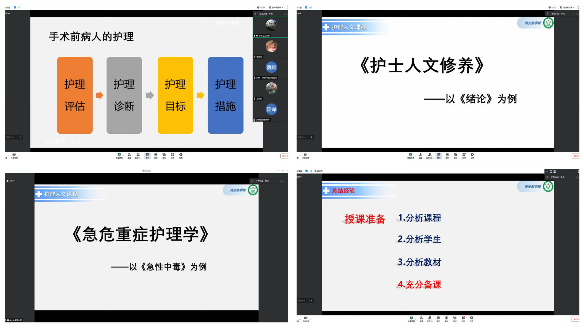首先,李贞围绕专业课程设计的核心要素,以《外科护理学》的术前护理、《护士人文修养》的绪论以及《急危重症护理学》的急性中毒章节为例,进行了精彩的教学设计分享,深入剖析了每个章节的教学目标和内容安排。随后,李贞结合自己的教学经历,进行了详细的经验分享。她强调课程分析、学生分析、教材分析及充分备课的重要性,介绍了如何精准定位课程目标、有效分析学情、整合优质学习资源等教学环节。同时,她还以《护士人文修养》和《急危重症护理学》为例,进行了教案书写的展示,为参会教师提供了宝贵的教案撰写参考。