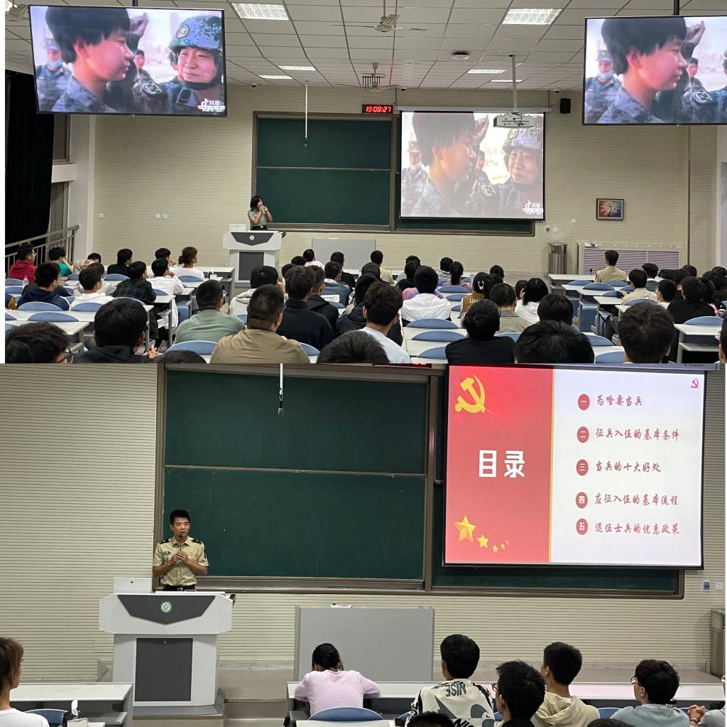 会议伊始,王秋燕老师作了以“热血铸军魂”为主题的征兵宣传,王老师从大学生征兵入伍的重要意义、基本条件、入伍学生的权益保障、就学、就业政策等几个方面做了详细系统的讲解,为让学生全面了解征兵政策做好服务保障工作。优秀退伍大学生阴耀荣给大家介绍了自己在部队的日常训练和生活,并结合自身分享了入伍优惠政策,他告诉同学们入伍服兵役不仅能够给自己的青春增添不一样的色彩,更是未来人生道路上的强大精神动力。优秀退伍大学生李妍同学通过与大家分享自己在部队生活训练的照片和视频,让同学们如身临其境般感受部队的真实环境。李妍同学告诉同学们部队的生活有苦有乐,既然选择了就要坚持做到最好,无愧于自己,无悔于青春。