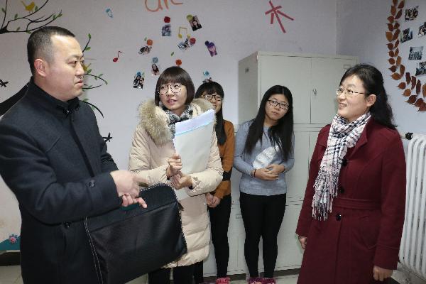 上午,熊书记一行来到护理学院5号宿舍楼南,分别参观了103、104、107、付113、116等宿舍,她对护理学院学生宿舍干净整洁的环境和学生们表现出良好的精神面貌表示肯定和满意。并和同学们亲切交谈,询问同学们在校宿舍生活情况,认真倾听了学生对学校学习生活、宿舍环境、供暖情况的意见。现场交流融洽,让冬日的早晨充满了正能量。