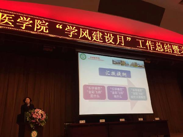 随后,在我校学术报告厅举行了“学风建设月”工作总结及表彰大会,本次大会由学工部副部长、学生处副处长李伟主持。首先,学工部进行“学风建设月”活动总结。接下来,bat365学生管理科科长昝倩进行了题为“乐学睿思”好学习,“舍彩飞扬”好生活——护理学院学风建设探索与实践的汇报。主要围绕着“乐学睿思”“舍彩飞扬”是什么,“乐学睿思”“舍彩飞扬”做什么,“乐学睿思”“舍彩飞扬”的成效以及发展展望这三方面内容进行详细介绍。“乐学睿思小课堂”学习篇项目通过帮扶小课堂的形式极大提高了同学们自主学习的能力;“舍彩飞扬”好生活项目通过以宿舍为单位的系列活动增强了同学们以宿舍为家的认同感。通过这两个项目的开展,逐步探索出了护理学院加强学风建设的新道路,但仍存在提升的空间和需要完善的方面。