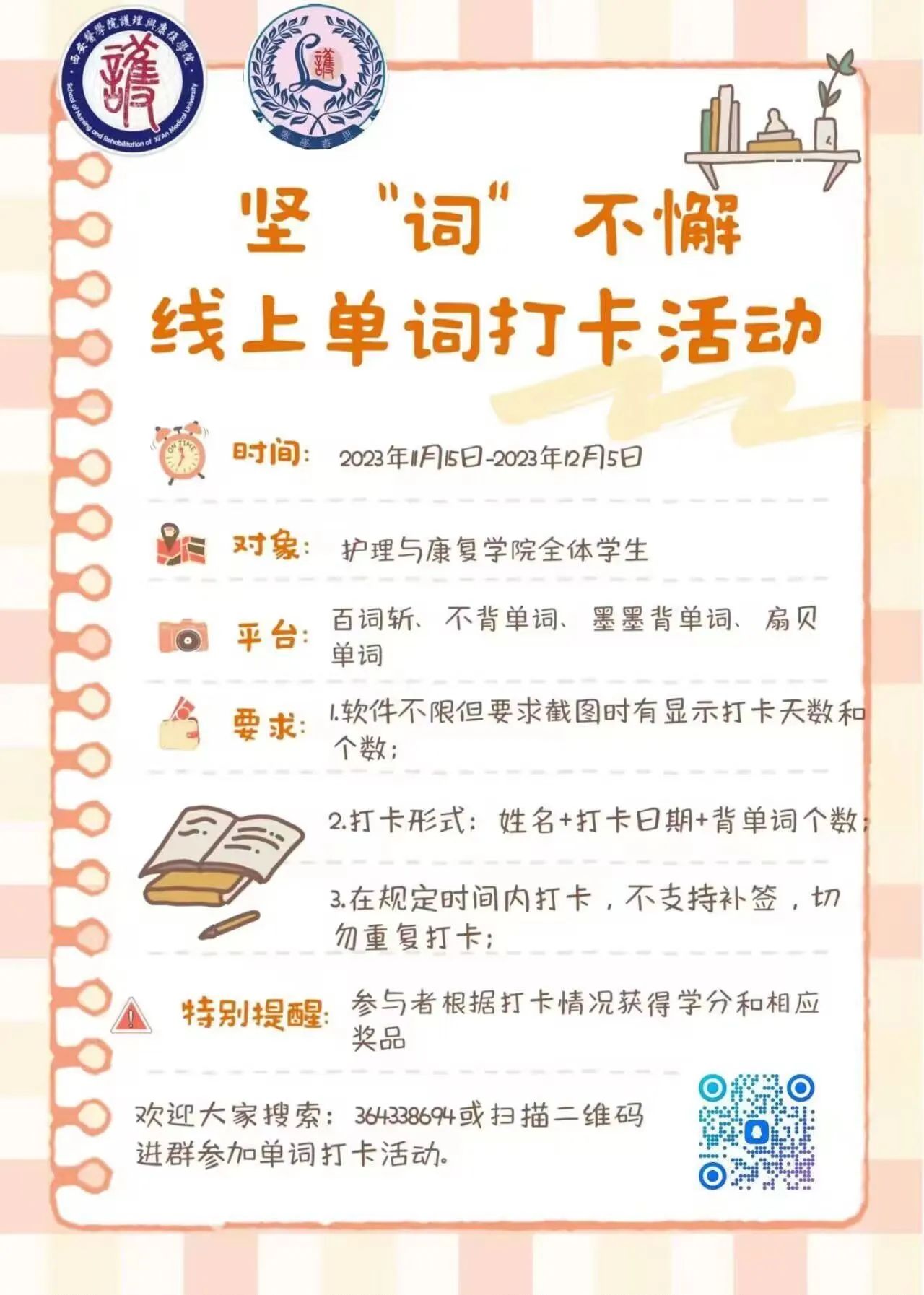 为了激发学院学生对英语单词学习的热情,营造良好的学习氛围,培养学生形成良好的学习习惯,并充实个人的英语知识储备,乐学睿思团举办“坚‘词’不懈”--线上单词打卡活动,为同学们顺利通过大学英语四六级或更高水平考试做好充分准备,在其未来的学术和职业发展中打下坚实的基础。