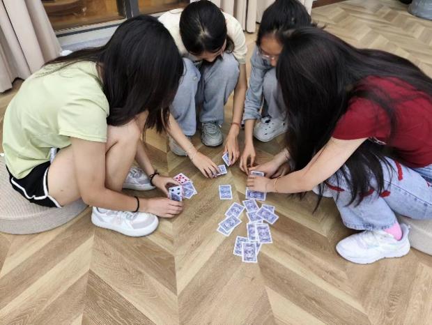 “路漫漫其修远兮”,挫折频繁地出现在一个人生命的各个阶段,如何面对挫折也是需要学习的课题,“扑克牌金字塔”活动中便蕴含着其中的道理。成员间通过小组合作将扑克牌搭建出金字塔,在搭建的过程中成员会经历多次搭建失败并重新思考尝试的过程。投射到我们的日常生活中,当挫折多次经历并超出了我们的承受范围时,应及时自我调节、寻求社会支持,停止情绪内耗与自我指责,敢于应对挫折。