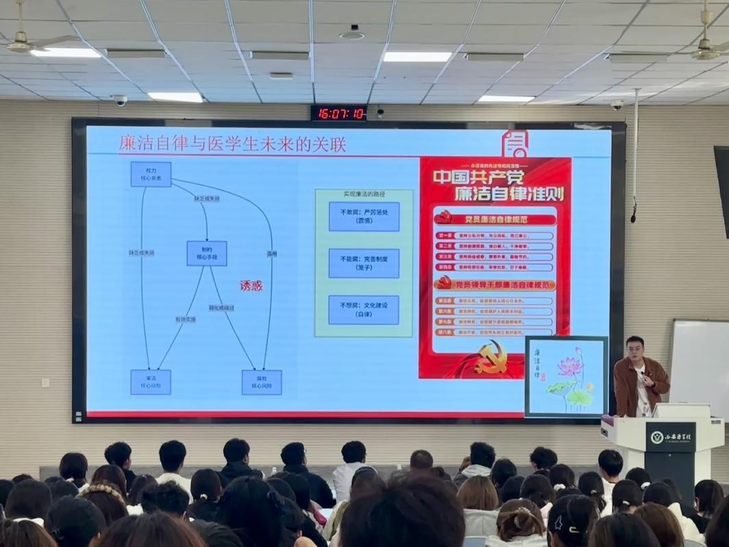 刘浩昂老师以《白袍守初心,廉洁铸医魂》为主题,从纪委的历史沿革讲起,以“以史为鉴,可以知兴替”引导同学们认识到纪律建设的重要性。他结合医学生未来职业特点,深入浅出地阐述了廉洁自律与医疗职业的内在联系,指出“廉洁不仅是道德要求,更是医者仁心的基本保障”。
