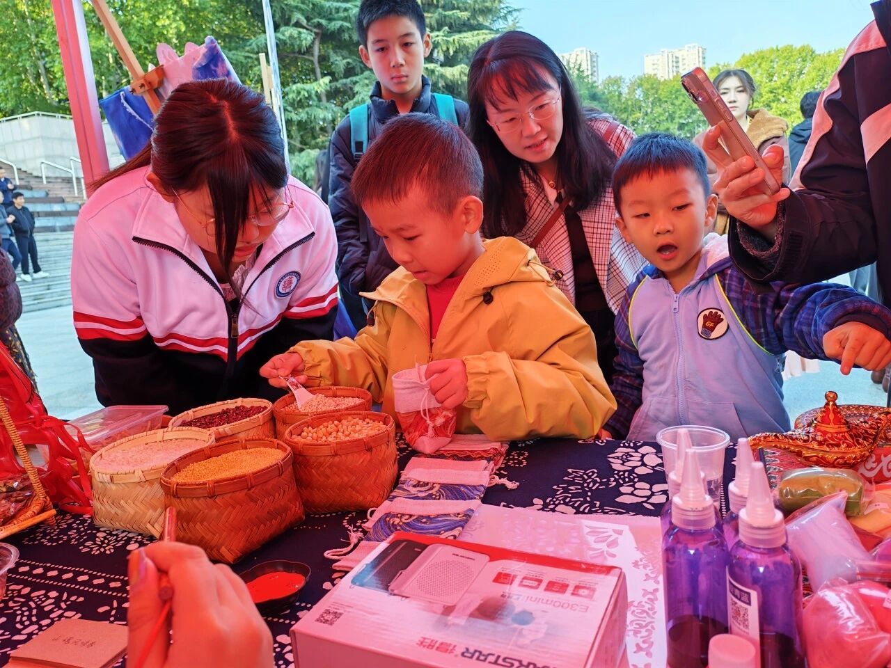 仡佬族文化展区以“红星米福·智启新篇”为主题,吸引师生纷纷驻足。展板前,大家凝神阅读民族特色,轻声交流,不时发出赞叹。点朱砂仪式成为互动焦点,参与者依次上前,在额间点上象征智慧与祝福的朱砂印,人群中不时响起掌声与欢笑。“红星米福”手作区内,师生们围坐一起,将五谷装入福袋、系上红绳,现场弥漫着淡淡的谷物香气;蜡染体验区则静谧而专注,参与者手执蜡刀,在布面上细心勾勒,传统纹样渐次浮现,仿佛穿越时空与古老文明对话。