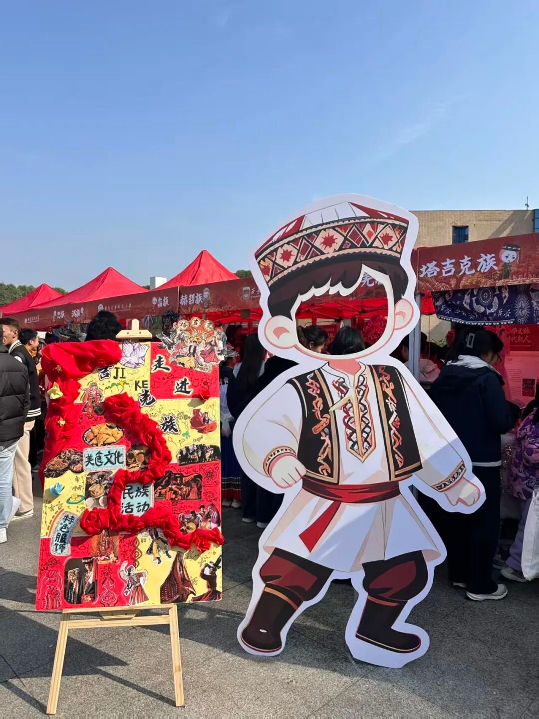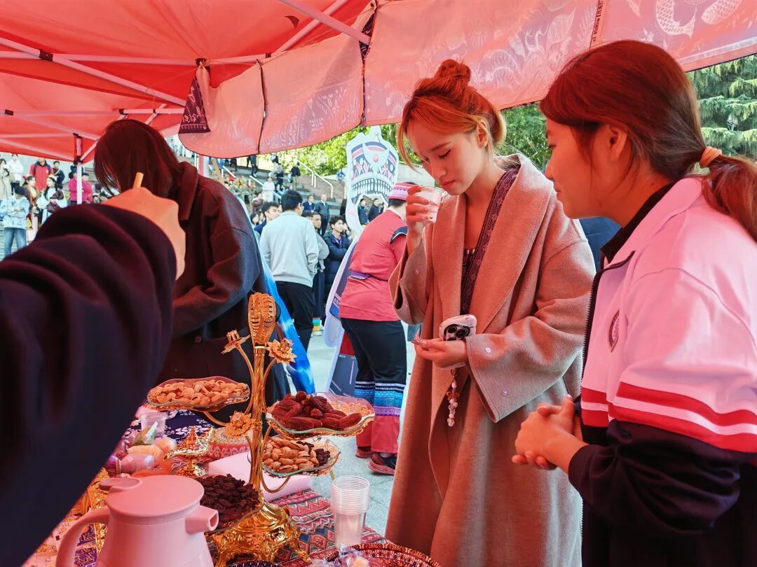 塔吉克族展区“毡影绘梦·花暖同心”同样气氛热烈。“毡上生花”戳绣体验前排起长队,师生们手持戳针,将彩色毛线一点点绣入毡布,渐渐绽放出花朵与飞鸟的图案,不时有人举起作品拍照留念,引来阵阵称赞。在故事分享环节,当聆听到塔吉克族世代守边、爱国奉献的感人事迹时,在场师生无不动容,神情中流露出深深的敬意与感动。随后,四个民族女孩为观众献上了独具特色的舞蹈,现场掌声雷动。活动尾声,特色美食区飘来阵阵香气,师生们品尝着民族特色美食,在享受美味的同时,也深深感受到塔吉克族文化的深厚与热情。