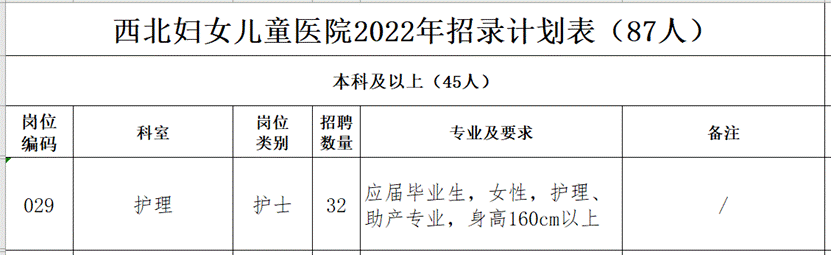 根据工作需要,本次公开招聘医、技、药、护、科研等卫生专业技术人员及行政后勤人员共计87人。具体招聘岗位及要求见附件《西北妇女儿童医院2022年招录计划表》。