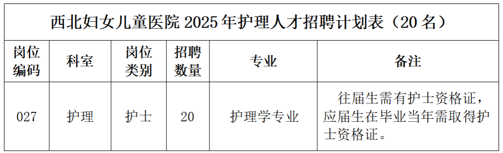 根据工作需要,本次公开招聘护理人员20名,详见《西北妇女儿童医院2025年护理人才招聘计划表》。