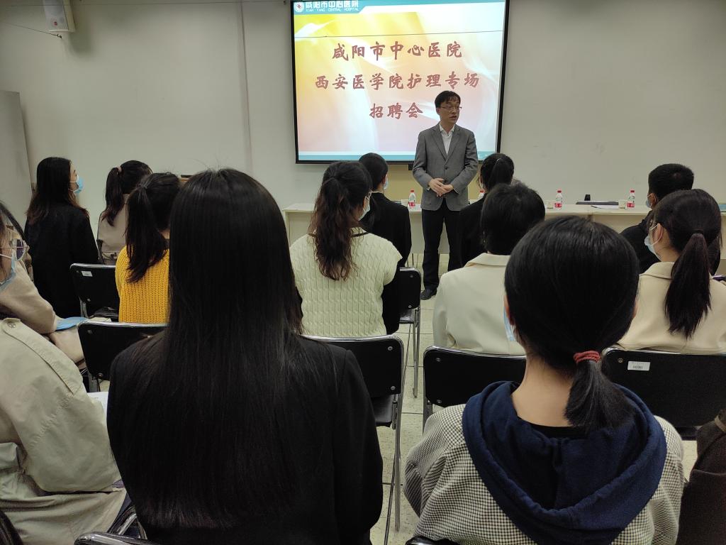 为进一步拓宽就业渠道,做好2021届毕业生精准就业服务工作,护理学院于2021年3月9日在含光校区图书馆二楼内厅举行咸阳中心医院专场招聘会。邀请咸阳市中心医院副院长徐晓峰、护理部主任范惠、人力资源部部长刘强及护理学院党总支副书记刘庆出席,就业专干袁青组织本次现场招聘会,共有164名毕业生参加。
