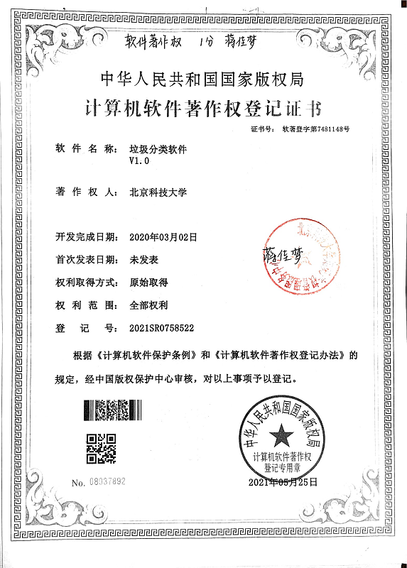 [7] 垃圾分类软件V1.0,登记号:2021SR0758522,2021-05-25