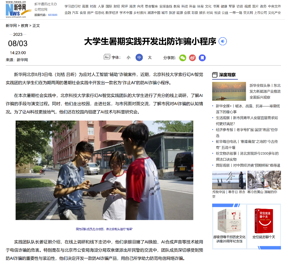 新华网对买球体育官方网站索行幻AI智觉实践团开发 “诈止AI”事迹进行报道