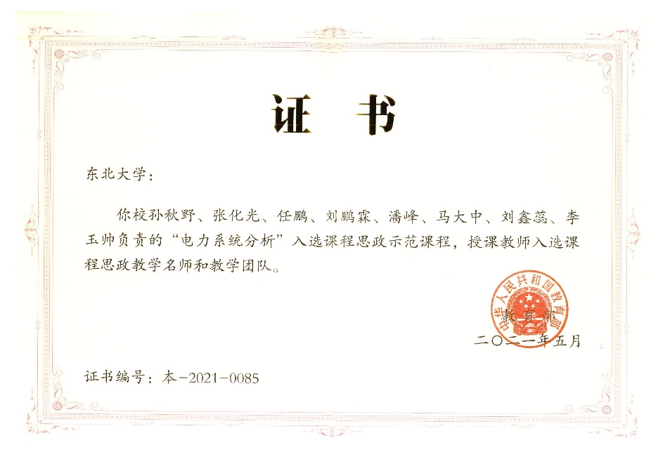 [8] 【教育部课程思政示范课程、教学名师和教学团队奖】2021年5月,电力系统分析获教育部课程思政示范课程,授课教师入选课程思政教学名师、团队入选课程思政教学团队