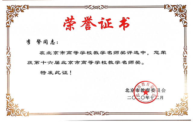 [20] 【教学名师奖】2020年12月,李擎获北京市高等学校教学名师奖