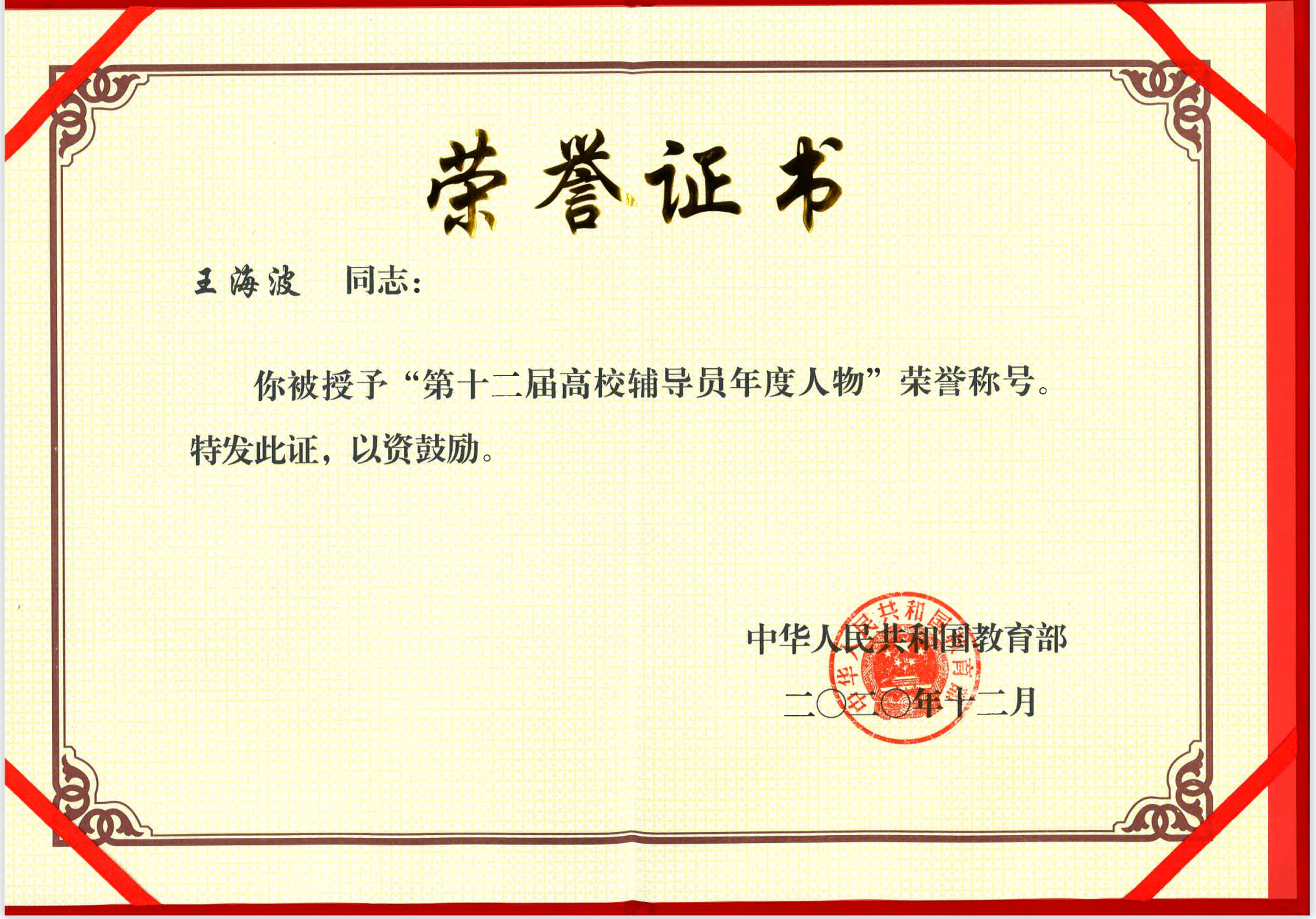 [12] 【高校辅导员年度人物奖】2020年12月,王海波获教育部“第十二届高校辅导员年度人物”