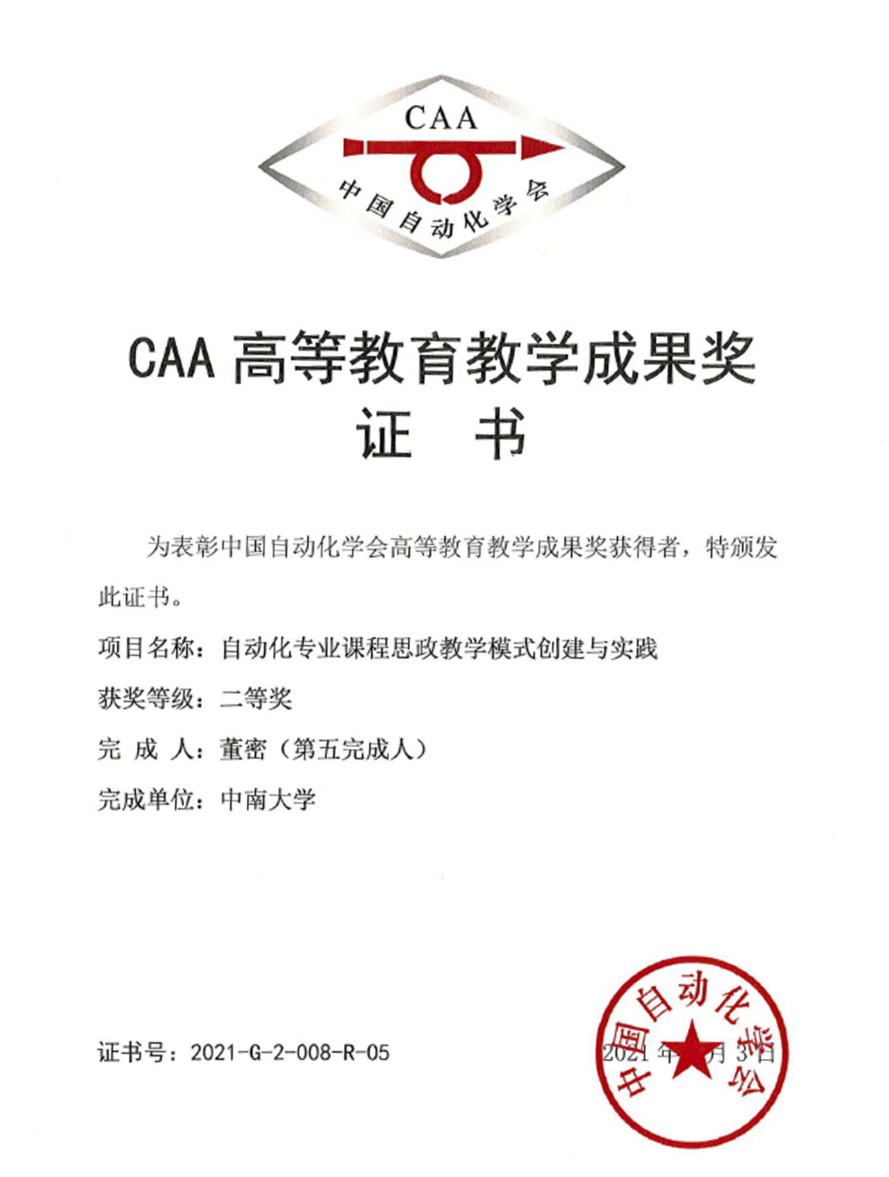 [16] 【教学成果奖】2021年6月,自动化专业课程思政教学模式创建与实践获CAA高等教育教学成果奖二等奖